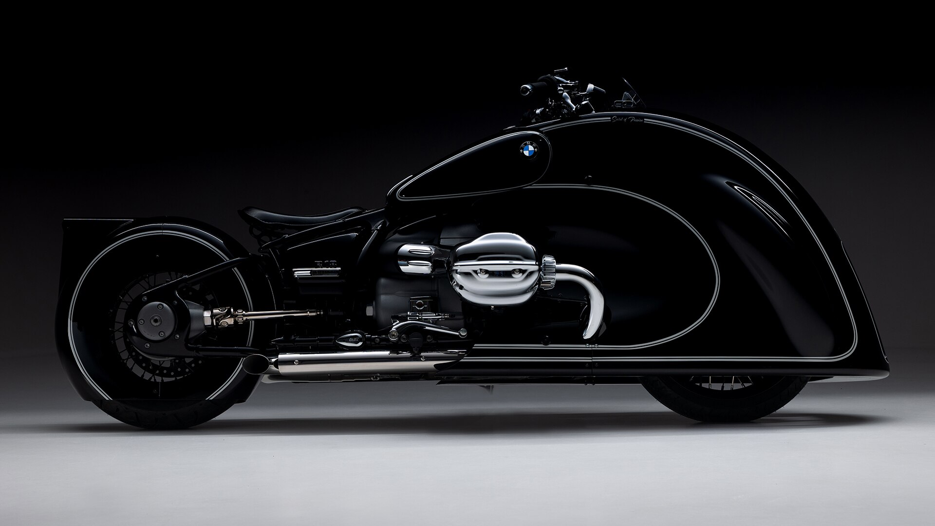 Cu numnai 8 mm de aer, carenajul îmbracă rezervorul. Astfel, culoarea clasică cu liniile duble iconografice se continuă aproape fără probleme pe impunătoarea componentă executată manuală. Desigur, vopseaua înfrumusețează și aripa din spate, care acoperă în mod superb 310 grade și preia astfel perfect designul frontal. Un mecanism cu articulație permite în primul rând înlocuirea roților. Deschiderile amplasate cu exactitate permit vizualizarea frânei cu disc și a acționării. Și de aici se vede ce anume constituie sufletul modelului Spirit of Passion: Acesta abordează proiectul modelului R 18 cu cel mai mare respect și devine el însuși o adevărată capodoperă.